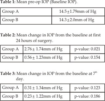 was used as significance cut off point. Results: There was no significant difference in mean pre-operative IOP of